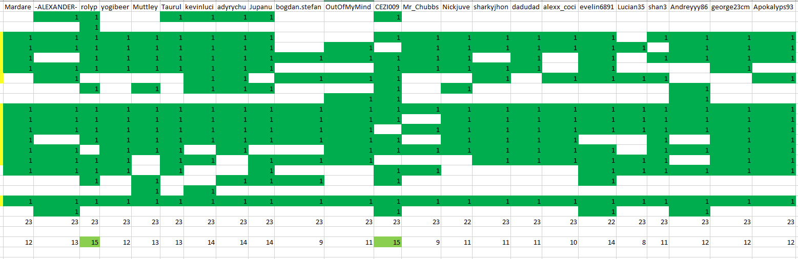 În urma verificării postărilor voastre, am avut doi finalişti, @rolyp şi @CEZI009, ambii cu 15 jucători ghiciţi. Foarte aproape de finală au fost: @kevinluci, @adyrychu, @Jupanu şi @evelin6891 toţi cu 14 jucători ghiciţi.