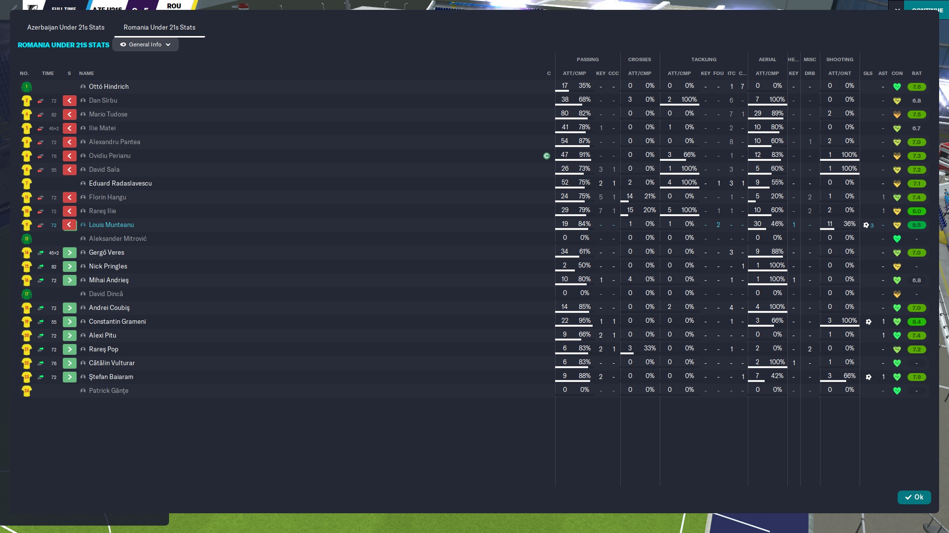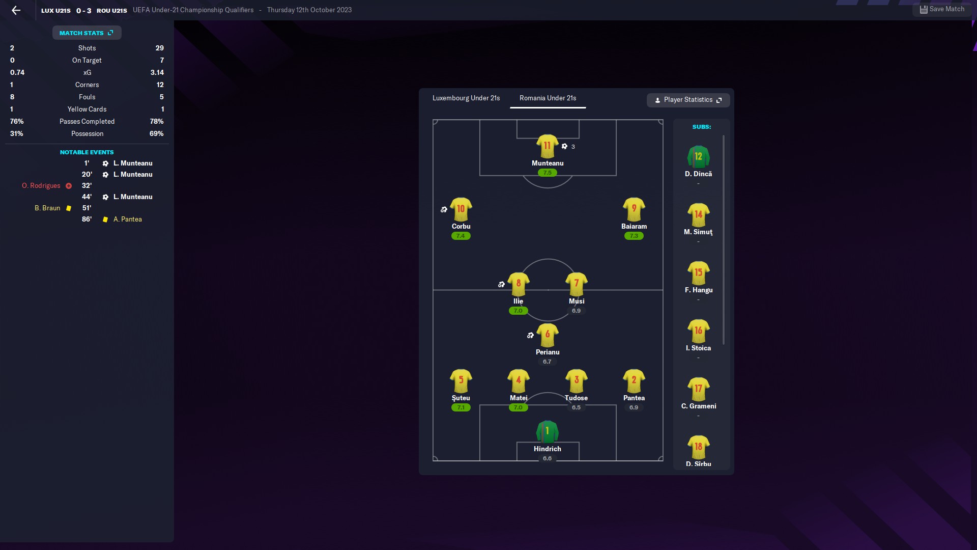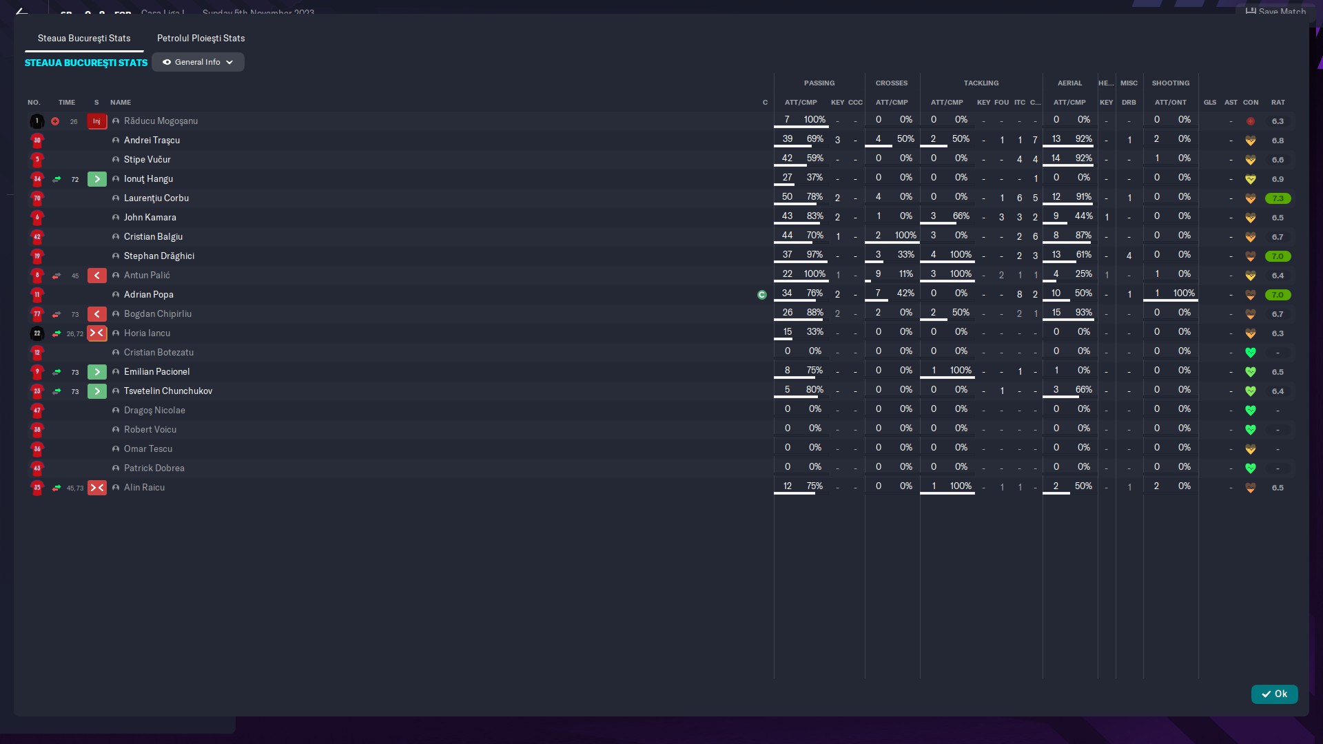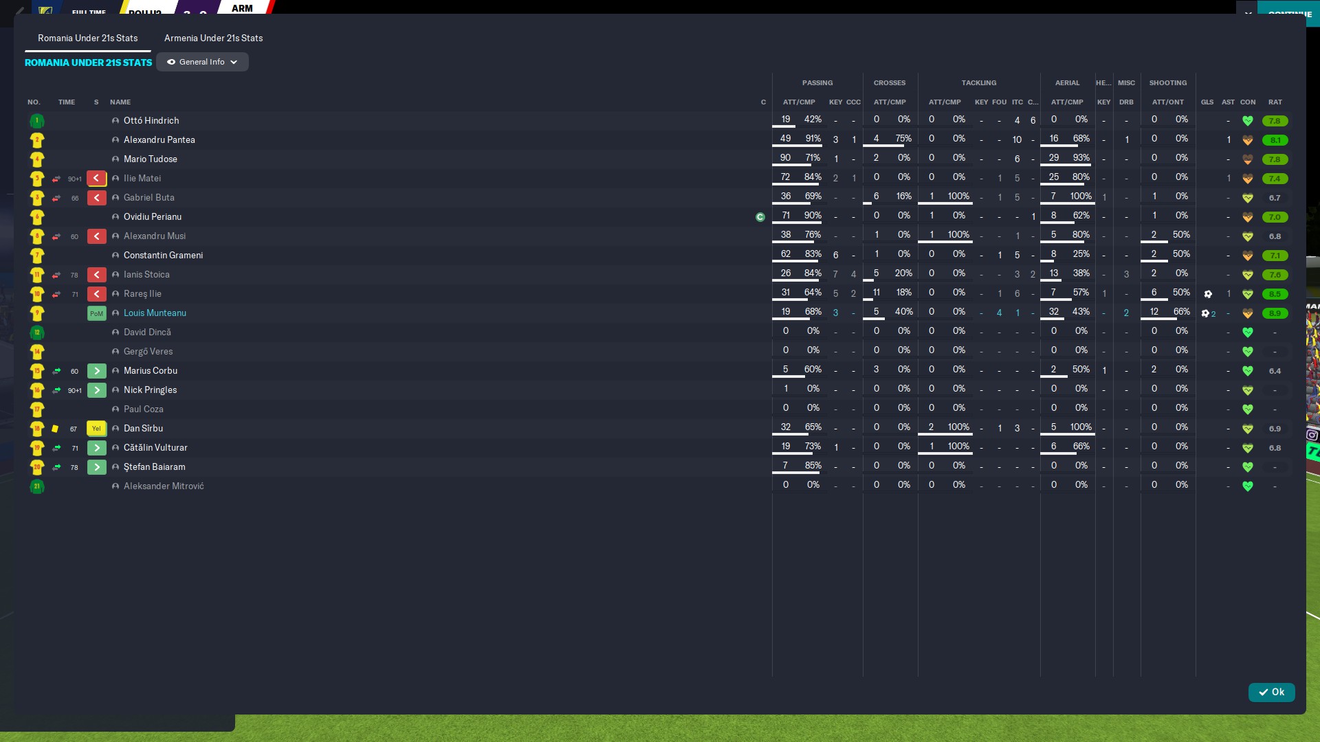 Tripla lui Munteanu i-a avut ca servanţi pe Perianu, Rareş Ilie şi Corbu, într-un meci în care schimbările s-au făcut în rândul tricolorilor de abia în ultimele şapte minute. Al nostru @hflorin a intrat în minutul 83, o dată cu Grameni şi Simuţ, în timp ce Dan Sîrbu şi Alexi Pitu au avut de aşteptat până în 89.