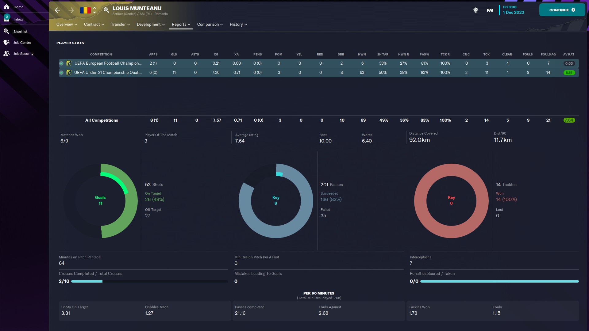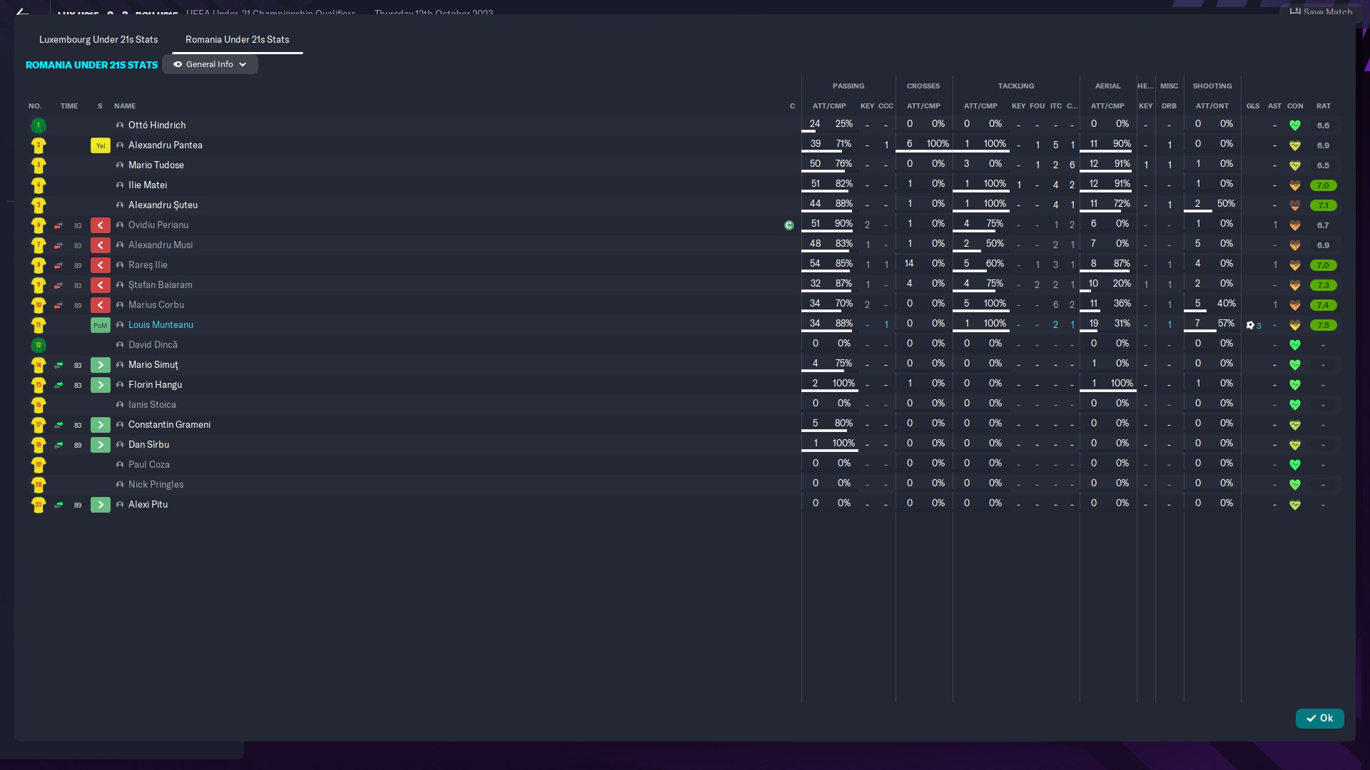 Mi se pare fabulos că Louis Munteanu este un monstru la naţionala de tineret, dar la echipa de club nu joacă deloc. Are 11 goluri în 6 meciuri jucate la tineret, plus nu mai ştiu câte anulate şi alte câteva şuturi în bară, niciun gol din penalty, 3 PoM, o medie a notelor de 8,15, 53 de şuturi dintre care jumătate pe poartă!