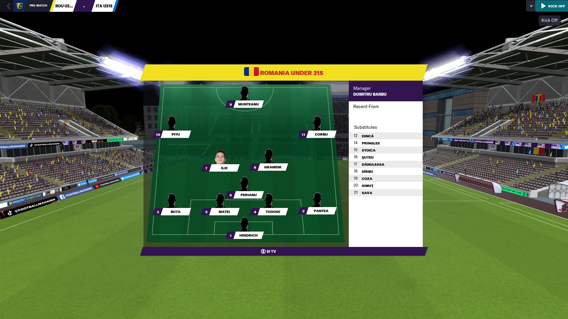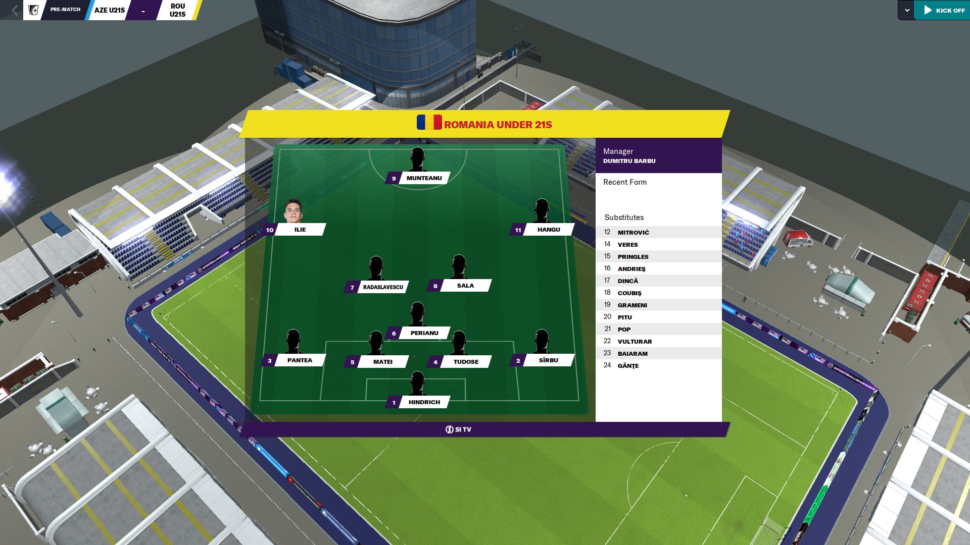 Hindrich între buturi, cu Pantea şi Şuteu pe benzi, iar Tudose şi Matei în centrul defensivei. Apoi Perianu DM, cu Musi şi Rareş Ilie în faţa lui, iar tripleta din avanposturi îi are pe Baiaram pe dreapta, Corbu stânga şi Louis Munteanu vârf împins.