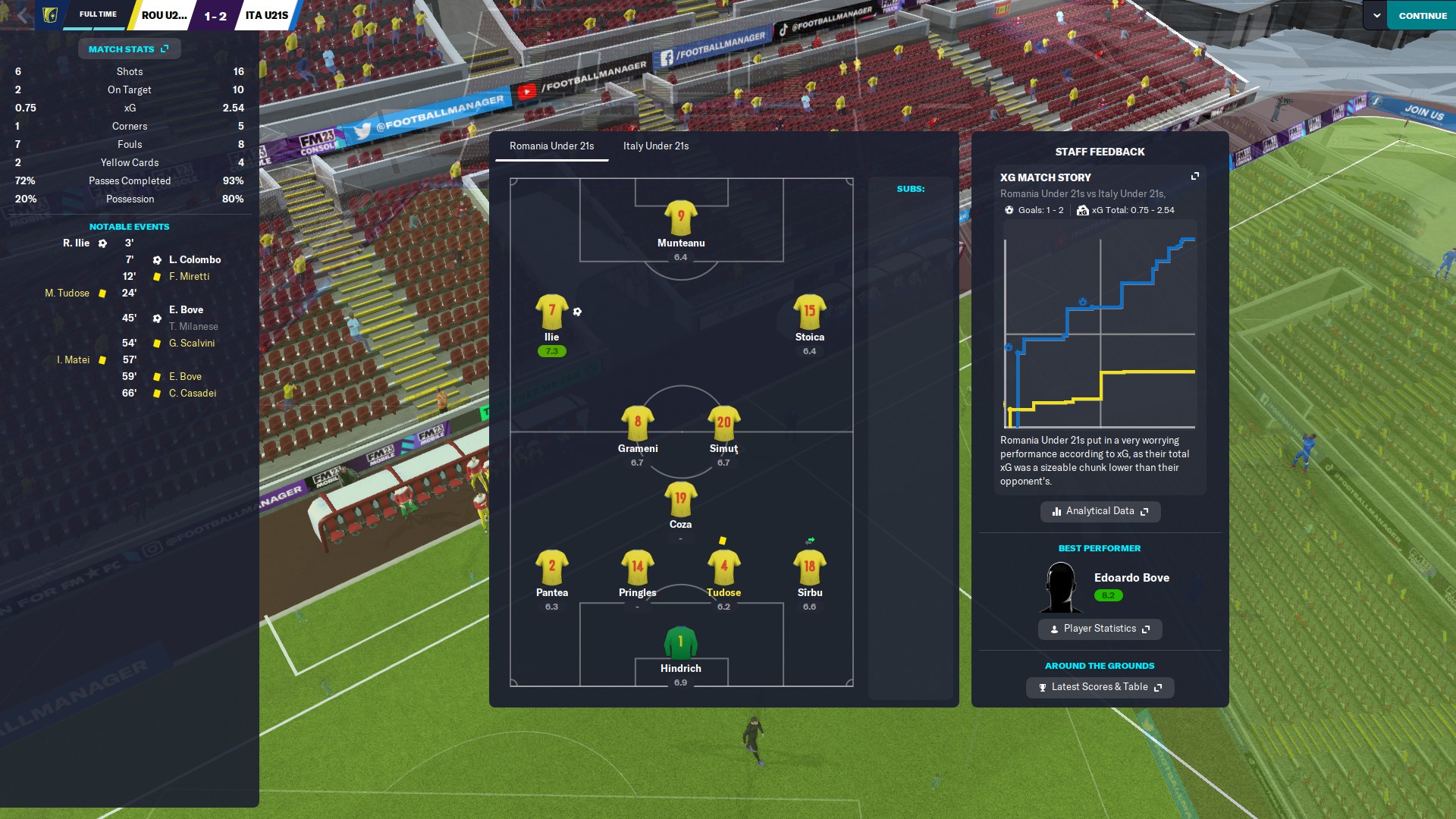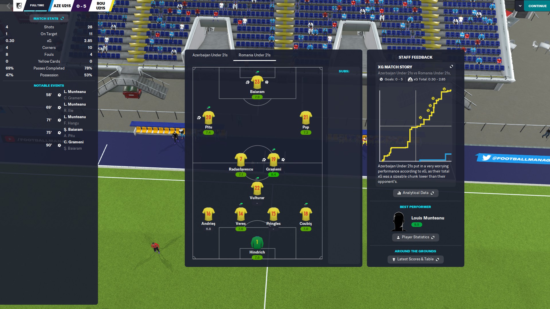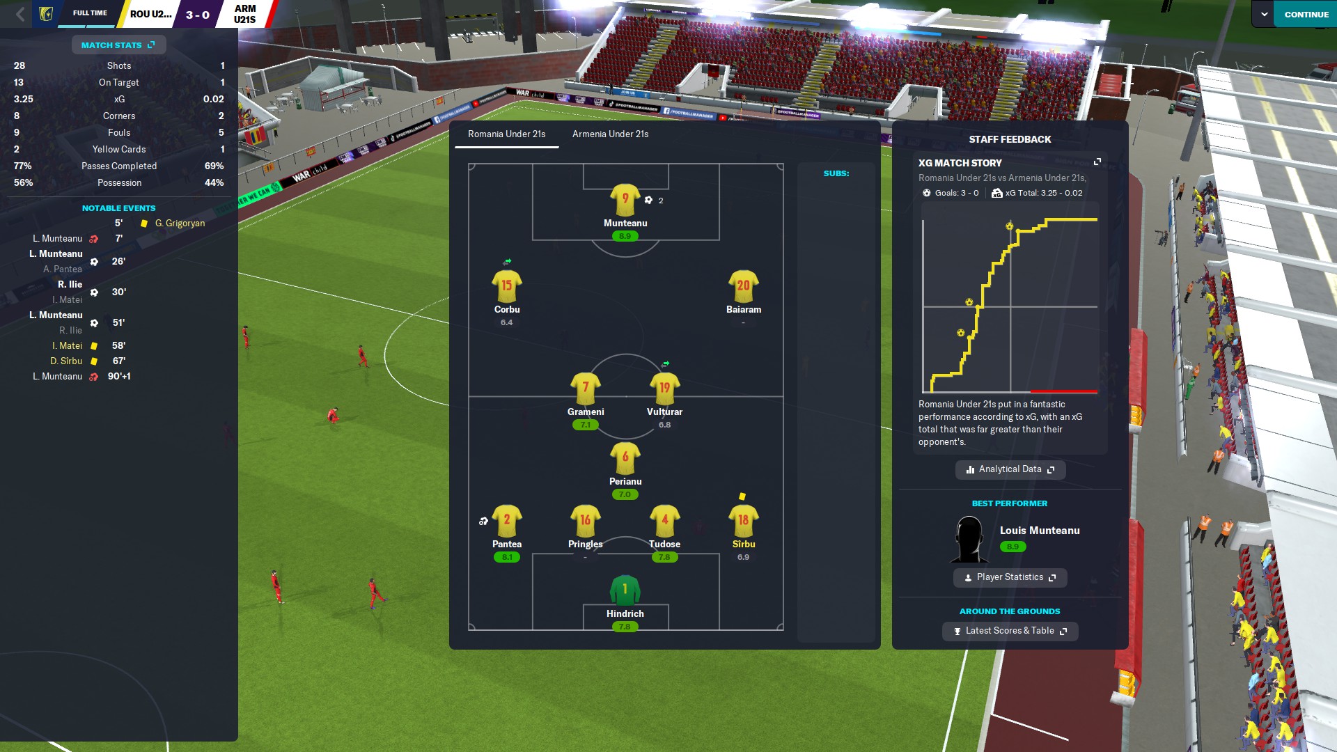 Povestea din meciul cu Armenia se repetă în sensul că tot la vreo cinci minute de la reluare înscriem pentru 3-0 şi tot prin Louis Munteanu. Dacă în meciul anterior la golul trei a fost servant Rareş Ilie, acum onoarea i-a revenit lui Ianis Stoica.