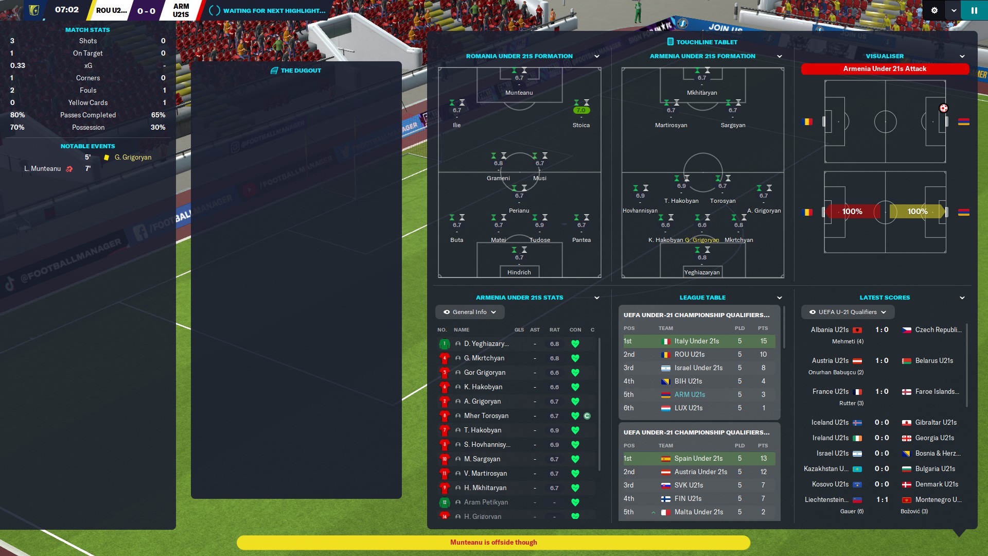 Louis Munteanu e ceva incredibil la naţionala de tineret, e în prim-plan la toate fazele de atac ale noastre şi dă gol în debutul partidei, dar este anulat pentru ofsaid. Portarul Armeniei face minuni cât poate, dar în minutul 25 tot capitulează în faţa atacantului Fiorentinei.