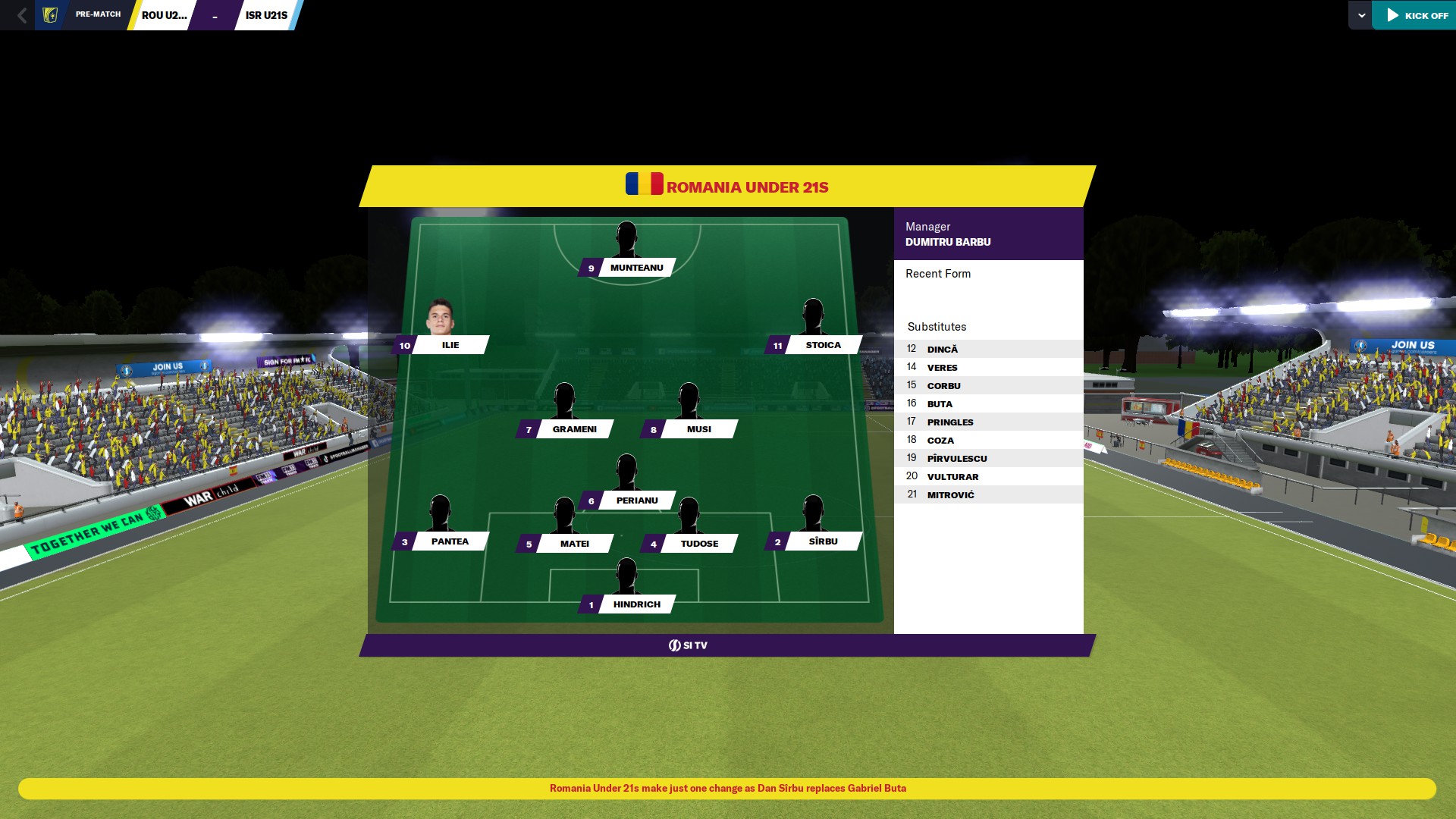 Urmează derby-ul cu Israel, în care putem lua o opţiune serioasă pentru locul 2 în clasamentul grupei de calificare la Euro U21, aşa că formula de start e cam aceeaşi ca în meciul cu Armenia, cu o singură modificare de jucător, dar şi una de poziţii: Sîrbu intră titular în locul lui Buta, dar ca DR, astfel că Pantea e mutat DL. Din păcate, tot fără @hflorin şi doar cu @mercenaries26 rezervă.