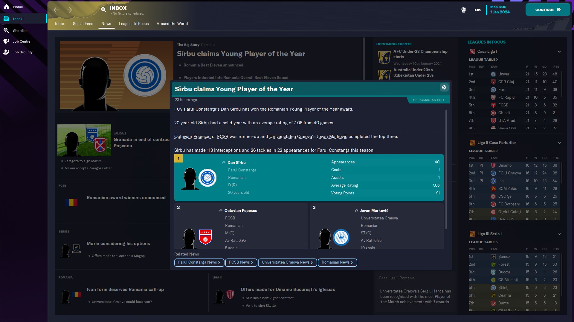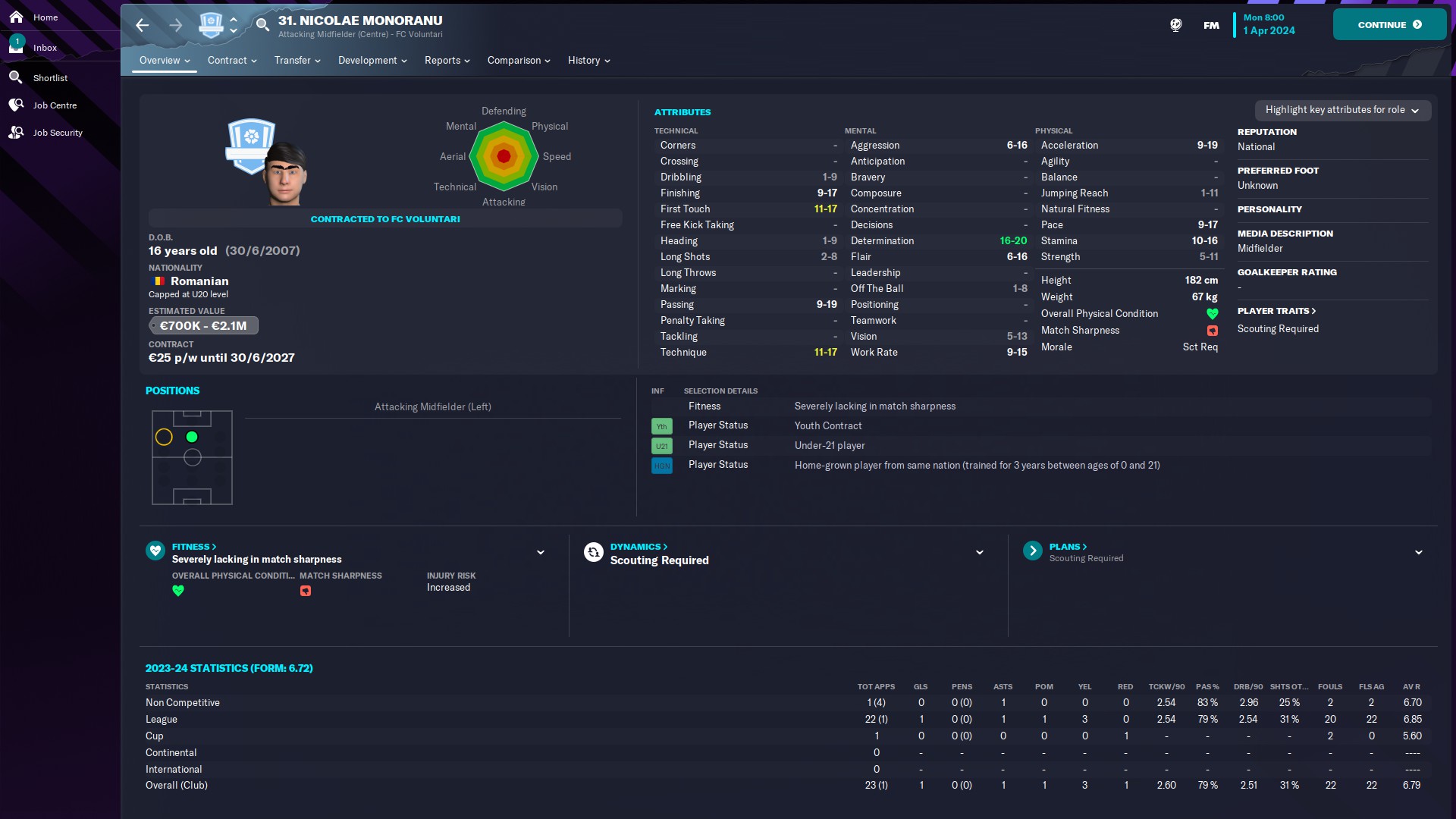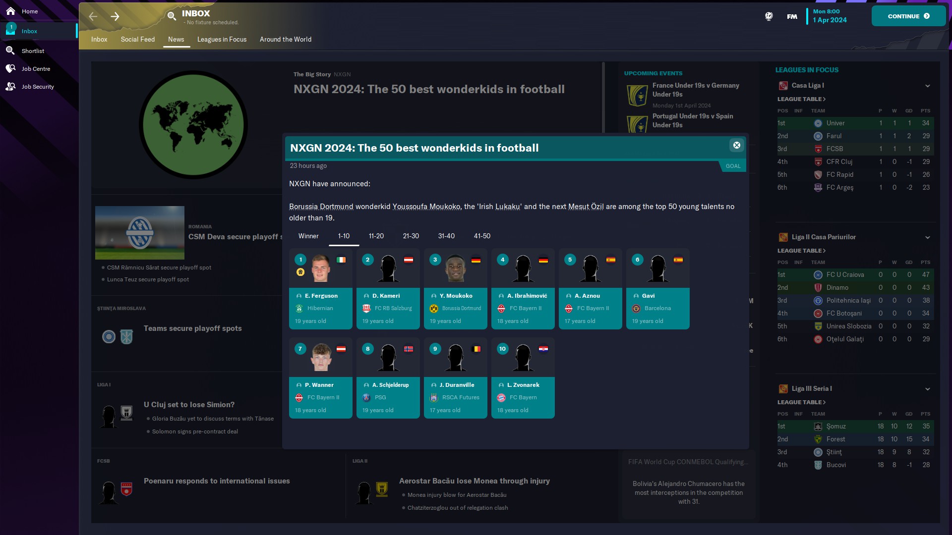 În altă ordine de idei, am primit topul NXGN 2024, cei mai buni 50 wonderkizi şi avem doi pe acolo: Tudose de la Benfica, aflat pe 41 şi un regen, Nicolae Monoranu, născut 2007, AMC, de la FC Voluntari, care e pe locul 37