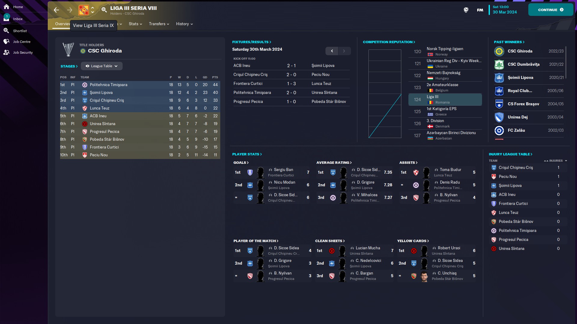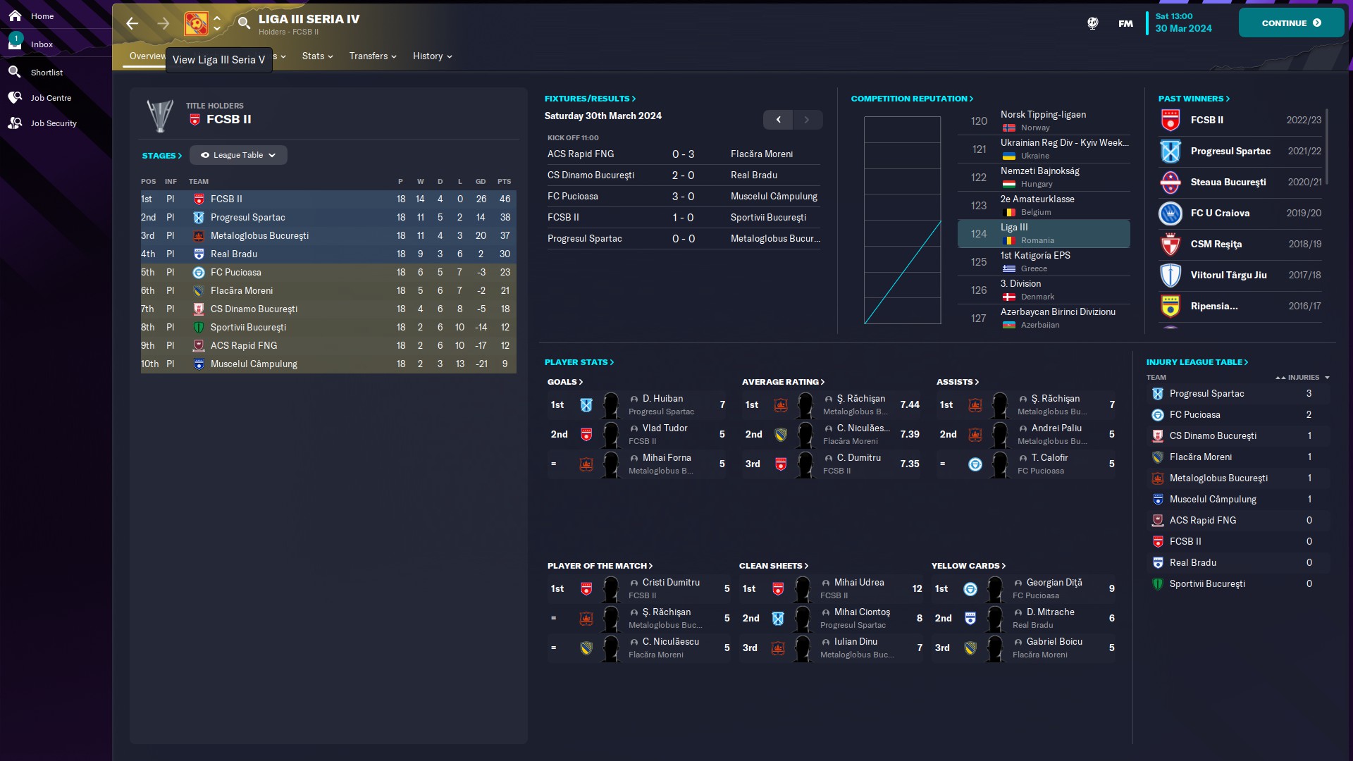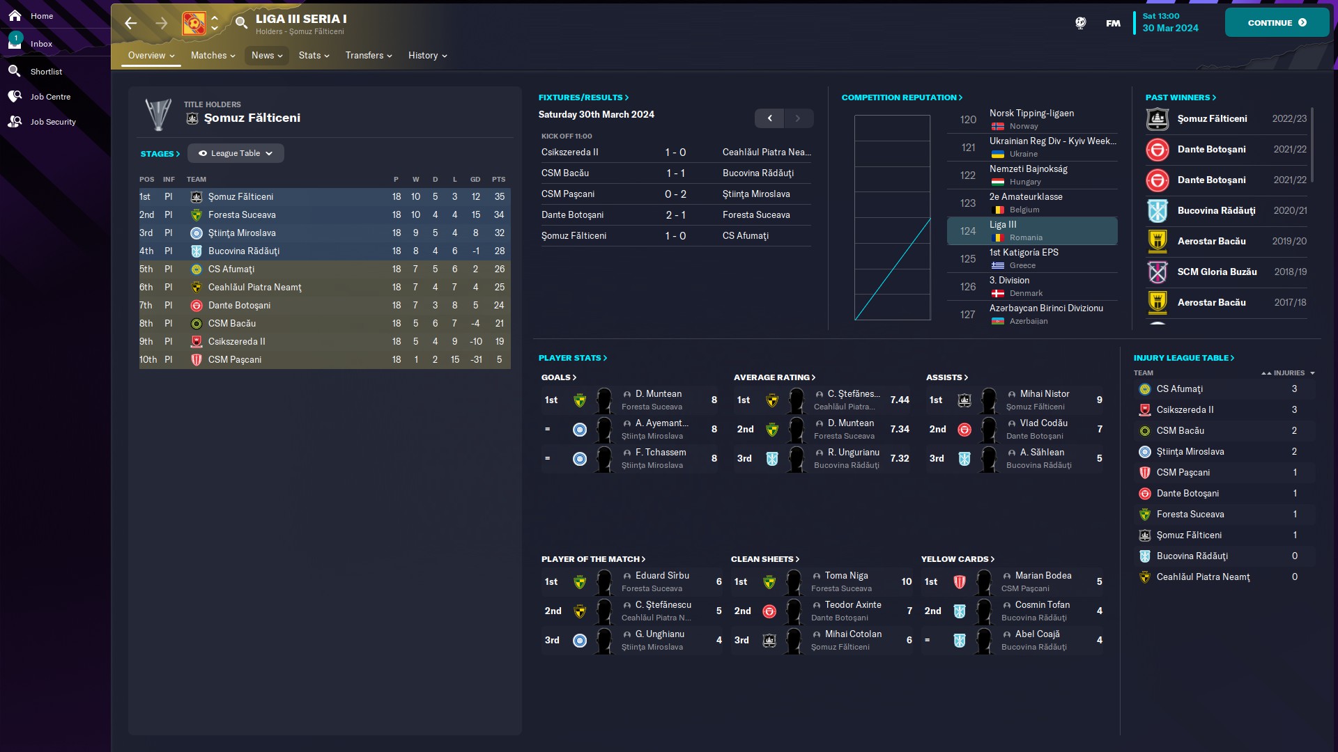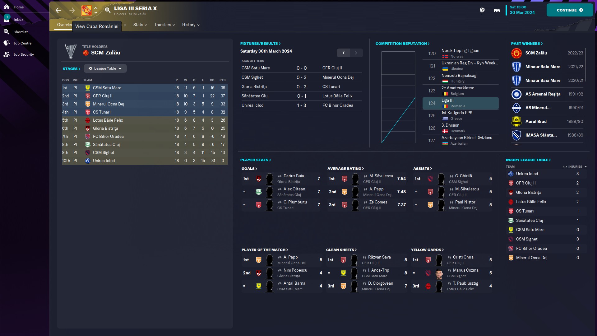 - seria 10: eterna poveste cu satelitul care se bate la promovare, aici CFR fiind la două puncte de Satu Mare. Also, cum rahat a ajuns Tunariul aici???!!  În altă ordine de idei, @myhay99 are cel mai mare av rating 7.54 şi e pe 1 la assisturi