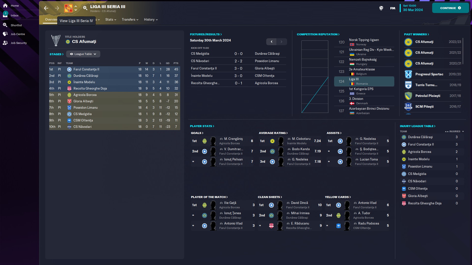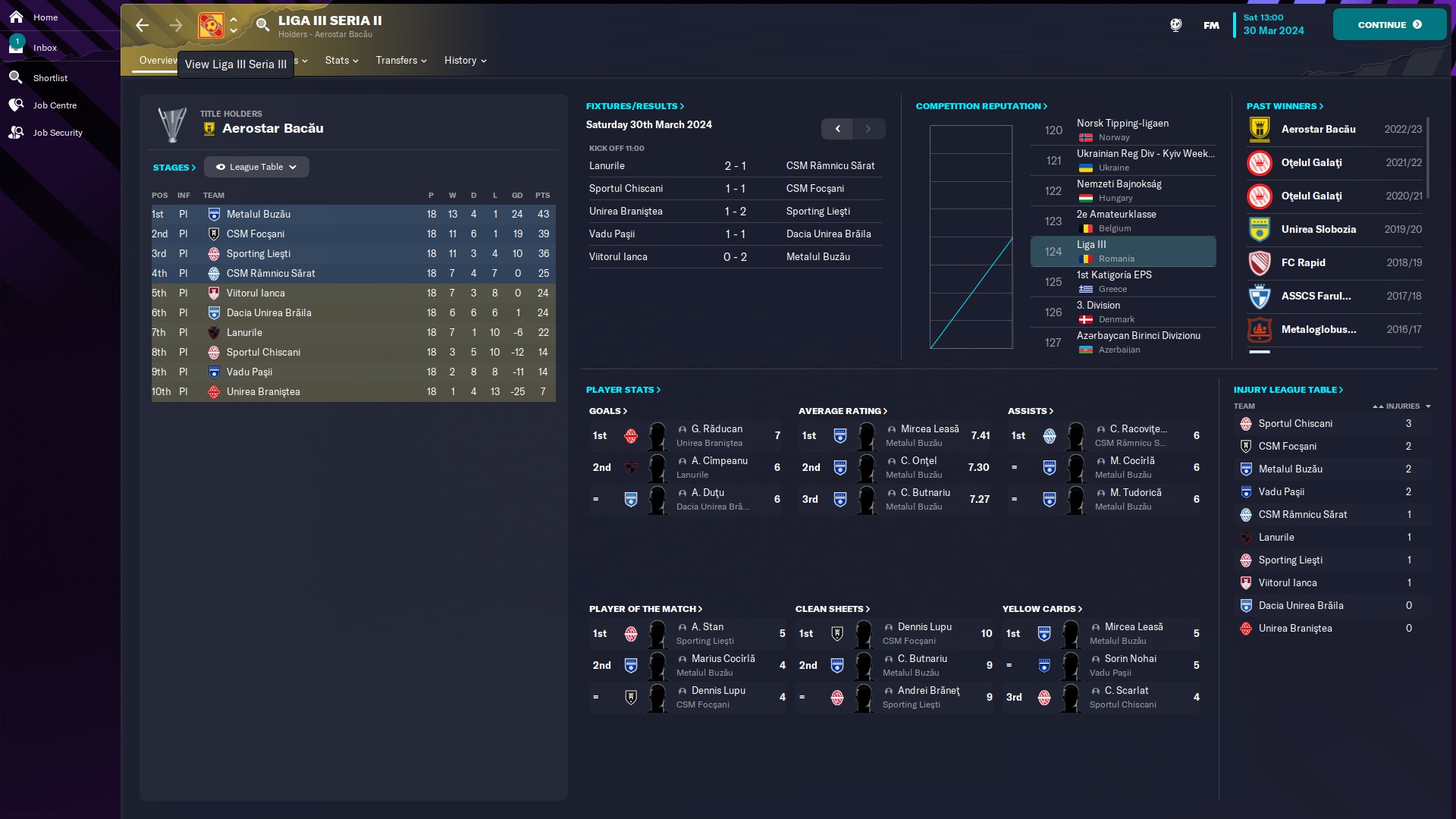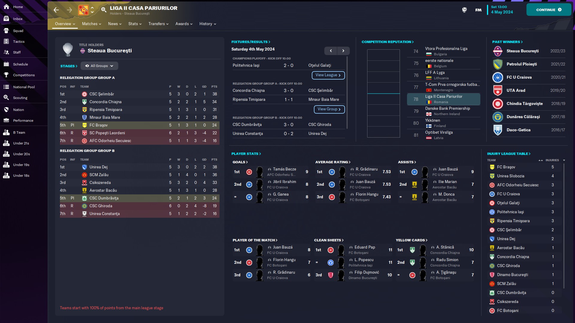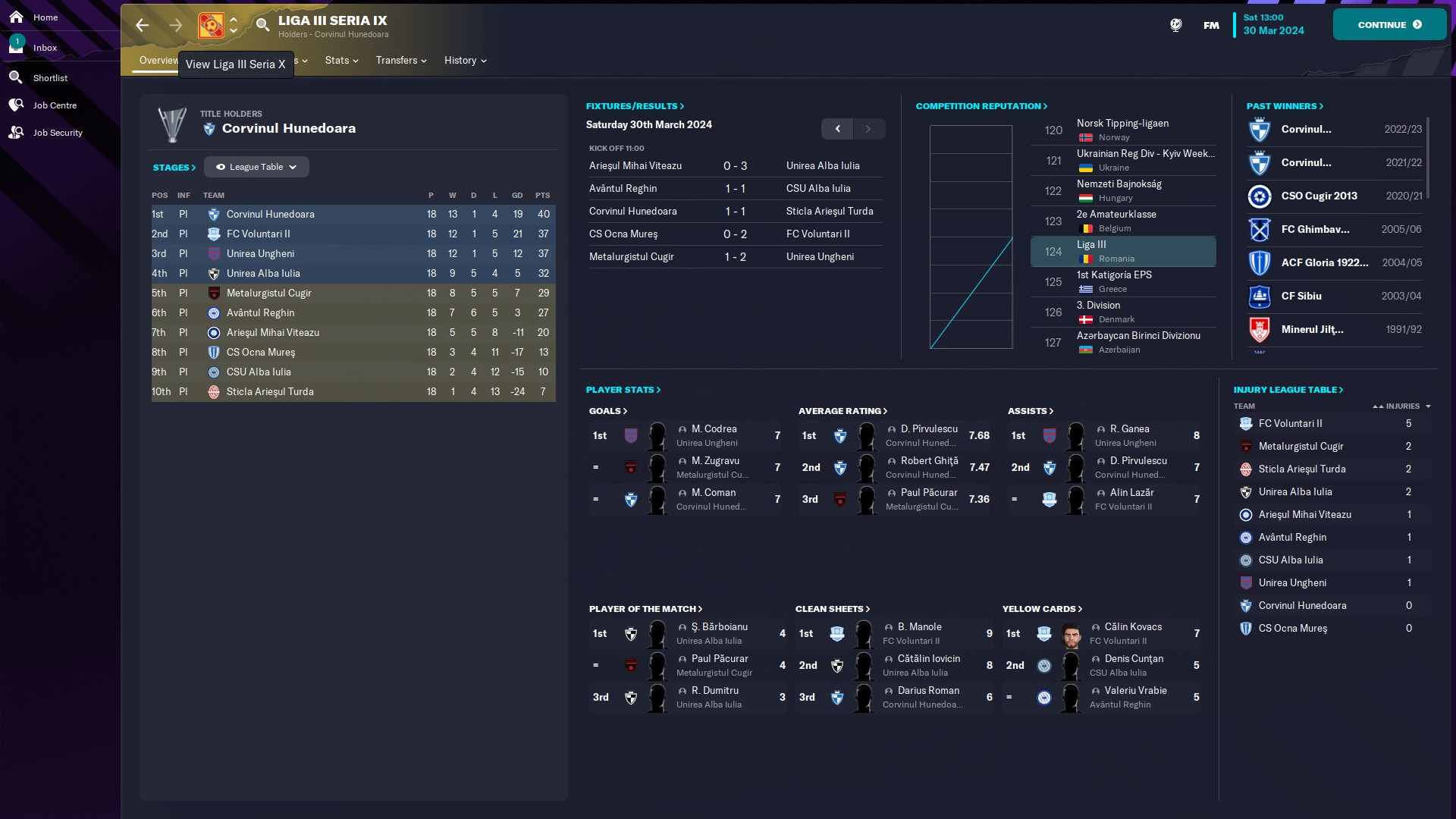 - seria 10: eterna poveste cu satelitul care se bate la promovare, aici CFR fiind la două puncte de Satu Mare. Also, cum rahat a ajuns Tunariul aici???!!  În altă ordine de idei, @myhay99 are cel mai mare av rating 7.54 şi e pe 1 la assisturi