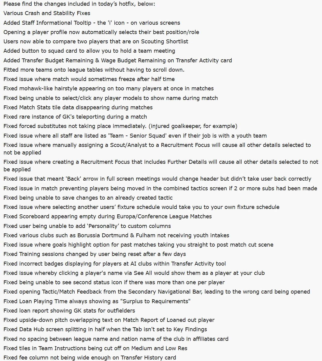 We’ve just released a hotfix (26.0.0.2224769) for the Football Manager 26 Advanced Access Beta that address’ some of the issues we’ve seen raised from our community since going live. These changes will be reflected in existing save files.